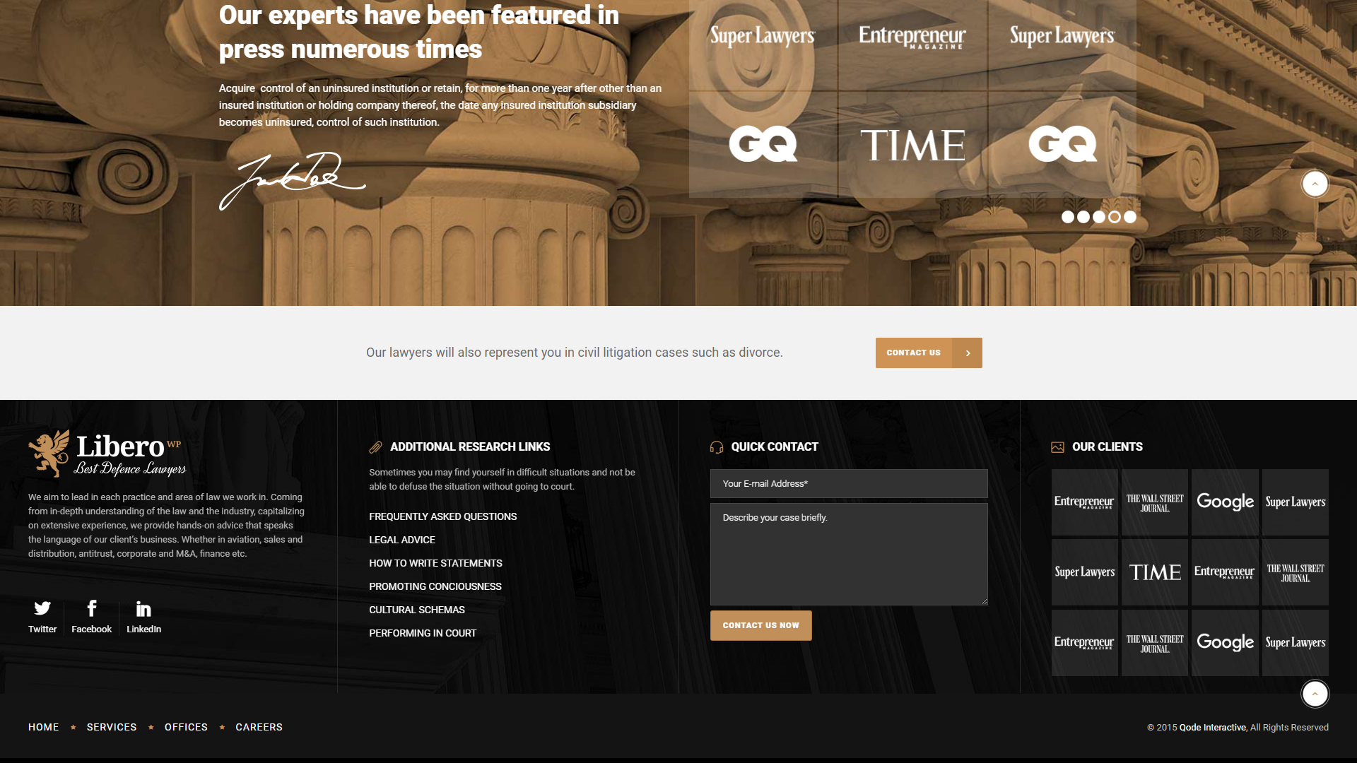 This elegant and professional WordPress website is specifically designed for law firms, legal advisors, and attorneys. Built on the powerful Libero theme, this website offers a fully responsive design that ensures a polished and authoritative user experience across all devices, from desktops to smartphones. The predefined styles and layouts are expertly crafted to showcase your legal services, attorney profiles, case studies, and client testimonials, making it easy to create a trustworthy and credible online presence. Whether you're looking to establish your law firm's identity, promote your legal services, or engage with potential clients, this template provides the perfect platform to elevate your legal practice.