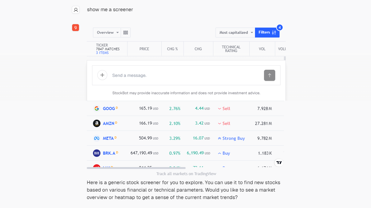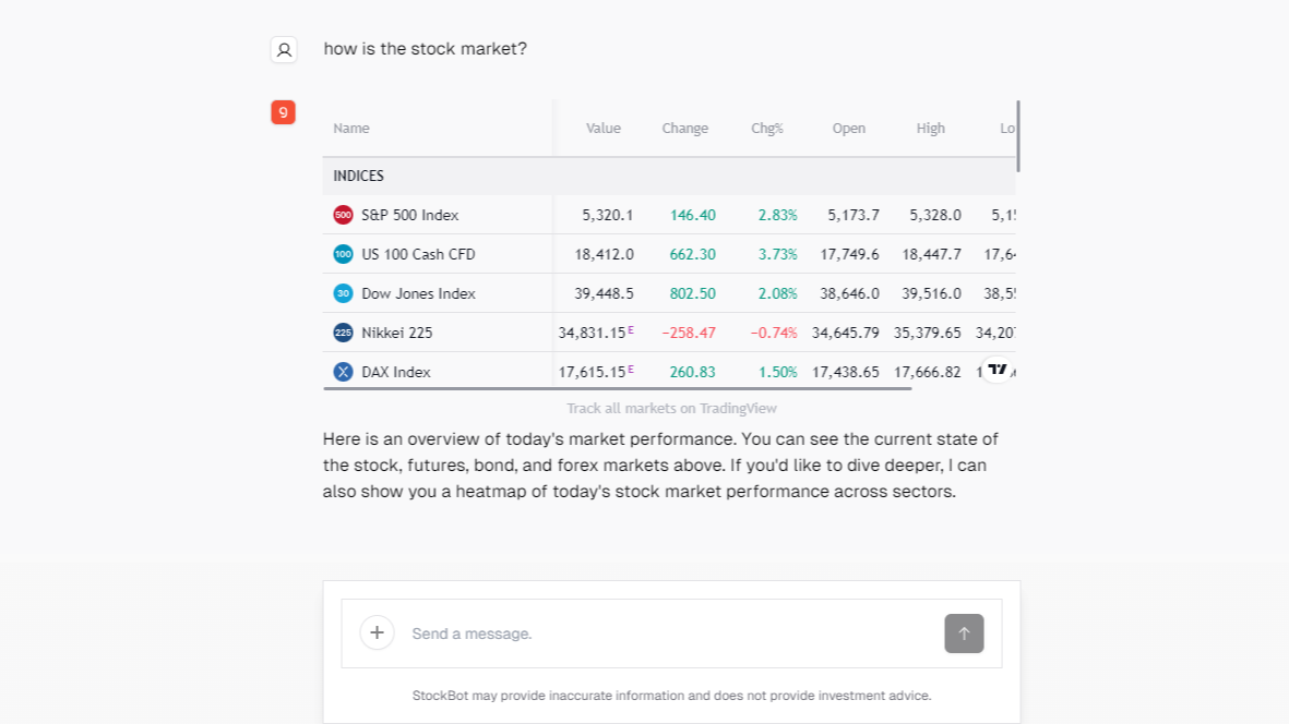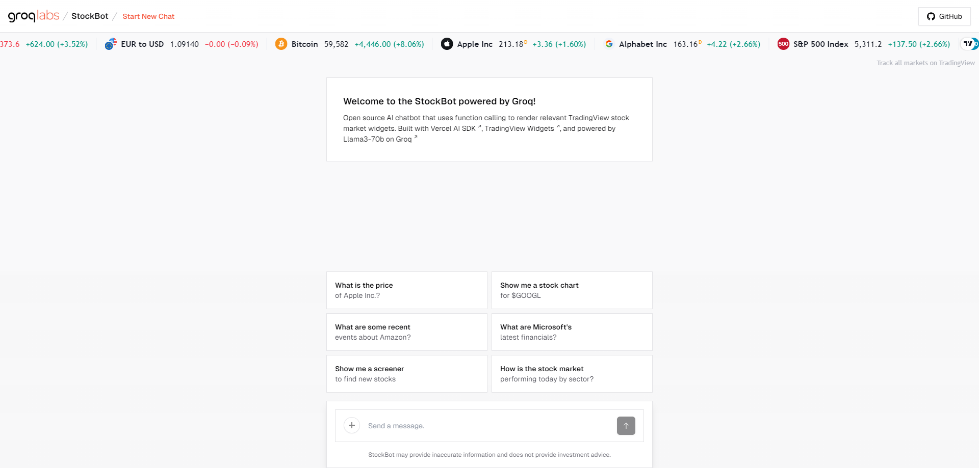 This AI-Powered Stock Market Analysis service, built using the "StockBot Powered by Groq" template from Vercel, is designed to provide real-time analysis and insights into the stock market using advanced AI technology. Ideal for investors, traders, and financial analysts, this tool leverages Groq's powerful processing capabilities to deliver accurate and timely data on stock performance, market trends, and investment opportunities. Whether you're managing a portfolio, researching stocks, or providing financial advice, this AI tool offers a comprehensive solution for integrating sophisticated market analysis directly into your website or application.